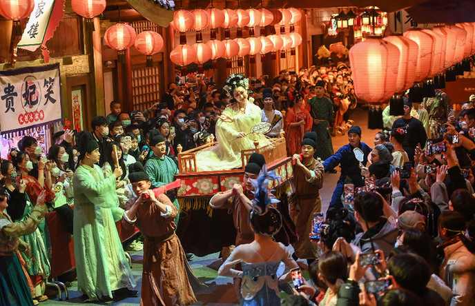 西安演藝集團(tuán)演員在長(zhǎng)安十二時(shí)辰主題街區(qū)演出。(資料照片)