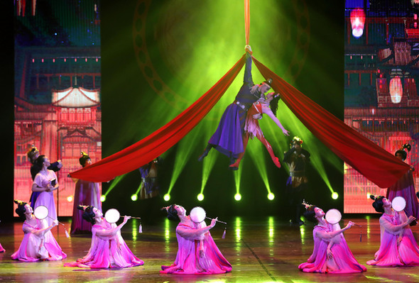??? 西安戰(zhàn)士戰(zhàn)旗雜技團(tuán)創(chuàng)作的雜技劇《星光燦爛之如夢(mèng)長(zhǎng)安》。 記者 梁愛平 攝