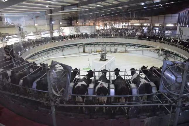 “一個(gè)9人班組,在3個(gè)小時(shí)左右的時(shí)間里能完成大約1900頭奶牛的取奶工作?!焙邶埥埣焉鷳B(tài)牧業(yè)有限公司副總經(jīng)理曹志達(dá)說,場區(qū)內(nèi)奶牛存欄量8500頭,日均產(chǎn)奶能達(dá)到150噸。