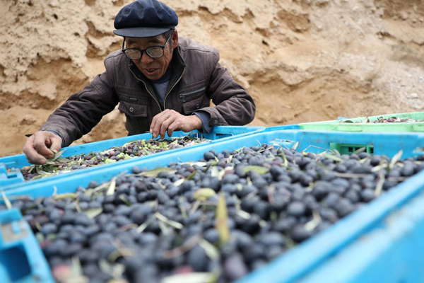 在甘肅隴南市,農(nóng)戶在整理剛剛采摘的油橄欖。新華社記者 陳斌 攝