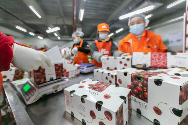 工作人員在綜合加工包裝中心包裝來(lái)自智利的車?yán)遄?。新華社記者 王翔 攝
