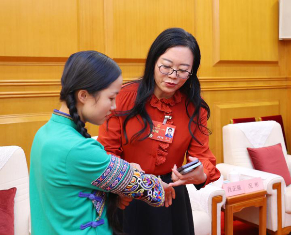 3月9日中午,貴州代表團分組審議結束后,夏華代表與楊昌芹代表交流苗繡紋樣的時尚化提取。
