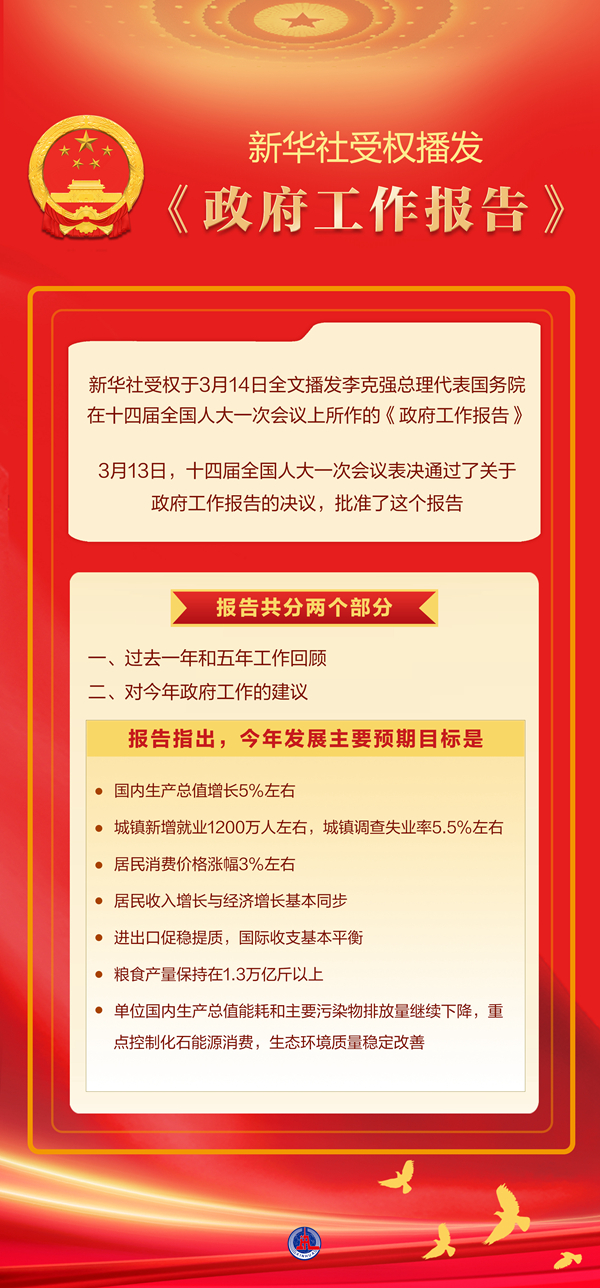 新華社北京3月14日電 新華社受權(quán)于14日全文播發(fā)李克強總理代表國務(wù)院在十四屆全國人大一次會議上所作的《政府工作報告》。3月13日,十四屆全國人大一次會議表決通過了關(guān)于政府工作報告的決議,批準了這個報告。