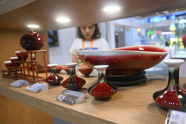 4月8日在第三屆中國國際消費(fèi)品博覽會展區(qū)拍攝的景德鎮(zhèn)瓷器。新華社記者 蒲曉旭 攝