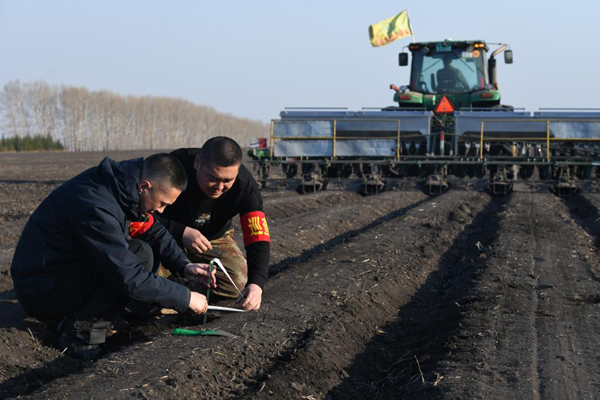 4月8日,在位于黑龍江省北安市的北大荒集團(tuán)建設(shè)農(nóng)場有限公司第四管理區(qū)一處農(nóng)田,農(nóng)業(yè)技術(shù)員在監(jiān)測施肥作業(yè)質(zhì)量。新華社記者 王松 攝
