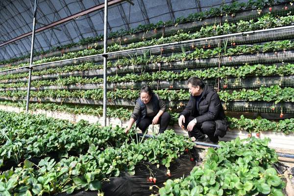 3月2日,在吉林市永吉縣口前鎮(zhèn),農(nóng)業(yè)技術(shù)人員(右)向農(nóng)民傳授草莓種植技術(shù)。新華社記者 張楠 攝