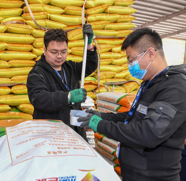 3月23日,在吉林省四平市梨樹縣一家農(nóng)資生產(chǎn)企業(yè),工作人員對企業(yè)生產(chǎn)的產(chǎn)品進(jìn)行抽樣檢驗(yàn)。新華社記者 張楠 攝