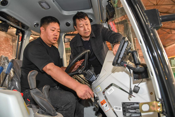 3月23日,在吉林省四平市梨樹縣白山鄉(xiāng)岫巖村,梨樹縣農(nóng)機(jī)推廣總站站長張志剛(右)幫助農(nóng)民調(diào)試農(nóng)機(jī)。新華社記者 張楠 攝