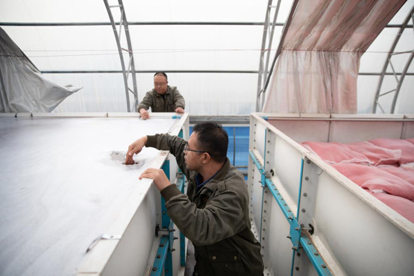 3月24日,在北大荒集團(tuán)八五〇農(nóng)場有限公司智能化水稻芽種生產(chǎn)中心,工作人員檢查浸種情況。新華社記者 張濤 攝