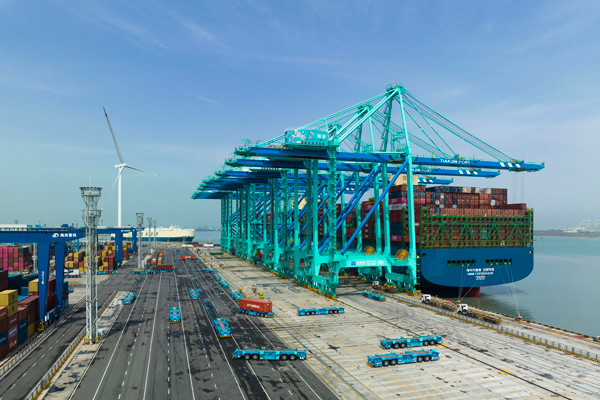 平靜而忙碌的碼頭上,高速智能岸橋有條不紊地裝卸千里而來的貨物,一車車集裝箱被穩(wěn)穩(wěn)運入堆場。
