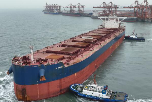 4月17日,一艘輪船在拖輪的協(xié)助下駛離唐山港曹妃甸港區(qū)礦石碼頭(無人機(jī)照片)。記者從河北省唐山市海洋口岸和港航管理局獲悉,今年1至3月份,河北港口集團(tuán)唐山港完成貨物吞吐量20163萬噸,同比增長12.73%。新華社記者 楊世堯 攝