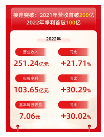 2022年,企業(yè)營(yíng)收再創(chuàng)歷史新高,繼2021年?duì)I收首破200億后,2022年企業(yè)凈利首破100億。不斷刷新的發(fā)展成績(jī),接連的發(fā)展突破,為其高質(zhì)量發(fā)展再添力證。
