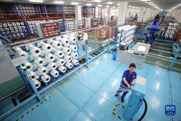 在位于江蘇省蘇州市吳江區(qū)的恒力(蘇州)產(chǎn)業(yè)園內(nèi)的高性能滌綸工業(yè)絲智能車間內(nèi),員工對(duì)工業(yè)絲進(jìn)行包裝前的外檢作業(yè)(3月15日攝)。新華社記者 毛俊 攝