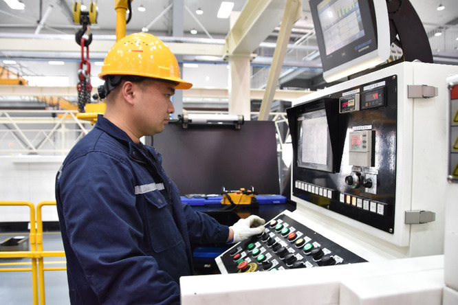 車間里高達3.6米、長24米、寬14米的大尺寸冷鐓機“吃”進去一圈圈鋼材,每分鐘能“吐”出45個大號螺栓,這些螺栓將用于起重機、盾構(gòu)機等大型工程機械。