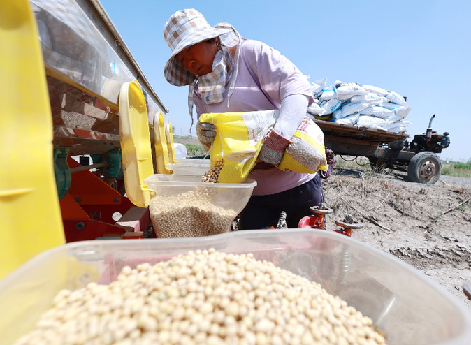 5月24日,唐山市豐南區(qū)王蘭莊鎮(zhèn)的農(nóng)民將準備播種的大豆種子倒入播種機。初夏時節(jié),河北省唐山市豐南區(qū)的農(nóng)民搶抓農(nóng)時播種玉米、大豆等農(nóng)作物。該區(qū)今年玉米和大豆播種總面積將達30萬畝。