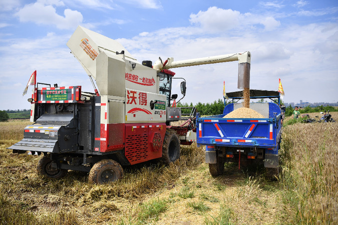 在西安市鄠邑區(qū)渭豐街道真守村,幾臺(tái)履帶式收割機(jī)一刻不停地在連片麥田里“聯(lián)合”作業(yè),將谷倉(cāng)填滿倒入翻斗車后,這些收割機(jī)又馬不停蹄地調(diào)轉(zhuǎn)機(jī)頭,再入麥田。“今年夏收已經(jīng)比往年晚了三四天,再不抓緊,就真的‘九成熟、十成收;十成熟、一成丟’了?!眮?lái)不及停頓片刻,收割機(jī)駕駛員王成旭又在另一壟麥田,繼續(xù)著機(jī)收作業(yè)。