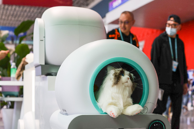 一家中國(guó)工業(yè)設(shè)計(jì)企業(yè)在第133屆廣交會(huì)上展示的全自動(dòng)貓砂盆等寵物電器。新華社記者 劉大偉 攝