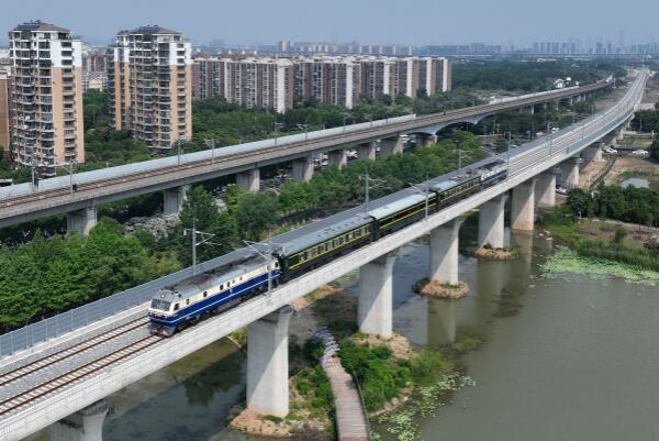 6月15日,檢測(cè)列車行駛在滬寧沿江高鐵南京市境內(nèi)的線路上(無(wú)人機(jī)照片)。