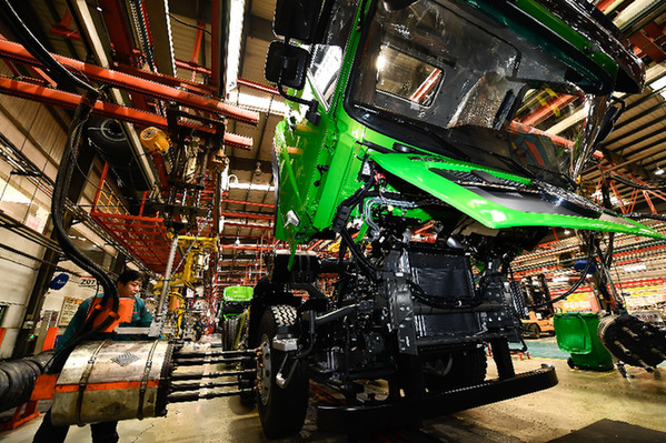 工人在中國重汽集團濟南商用車有限公司整車裝配生產線上作業(yè)。記者 郭緒雷 攝