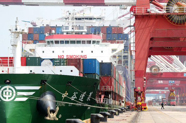 一艘貨輪在青島港前灣聯(lián)合集裝箱碼頭裝載貨物。新華社發(fā)(張進剛 攝)