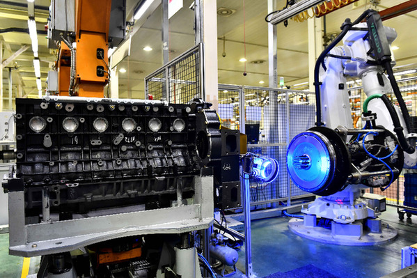 在位于山東濰坊的濰柴集團總裝車間,機器人在流水線上裝配發(fā)動機。記者 郭緒雷 攝