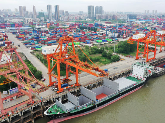 “華航漢亞2號(hào)”貨輪??吭谖錆h新港陽邏集裝箱碼頭進(jìn)行裝箱作業(yè)(2020年5月9日攝,無人機(jī)照片)。新華社發(fā)(趙軍 攝)