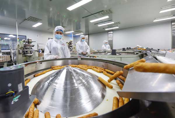 河北邱縣一家面包生產(chǎn)企業(yè)工人在生產(chǎn)車(chē)間工作。