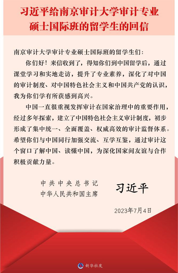 習近平在回信中說,得知你們到中國留學后,通過課堂學習和實地走訪,提升了專業(yè)素養(yǎng),深化了對中國的審計制度、對中國特色社會主義和中國共產黨的認識,我為你們學有所獲感到高興。
