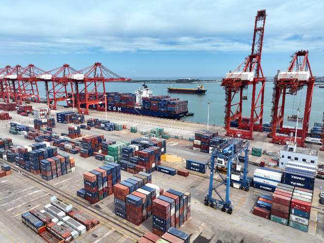 7月16日,貨輪在江蘇連云港港集裝箱碼頭泊位上裝卸集裝箱(無(wú)人機(jī)照片)。據(jù)統(tǒng)計(jì),2023年上半年,江蘇連云港港累計(jì)完成貨物吞吐量1.49億噸,同比增長(zhǎng)11.7%;集裝箱完成284.36萬(wàn)標(biāo)箱,同比增長(zhǎng)15.4%。