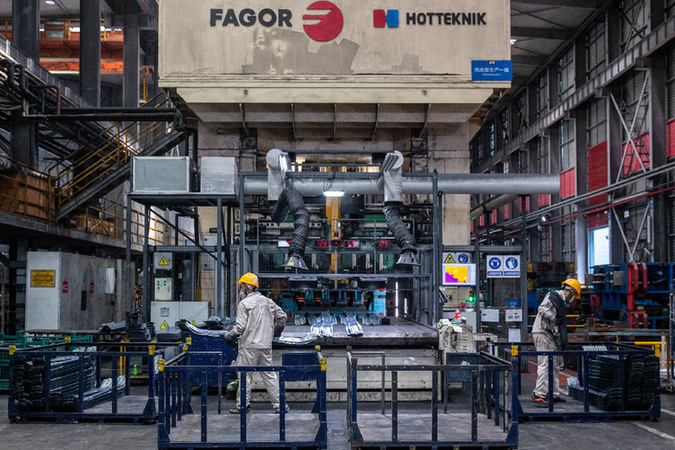 7月16日,在位于重慶市兩江新區(qū)的重慶至信實業(yè)集團有限公司熱壓車間,工人將剛下線的零件裝箱。