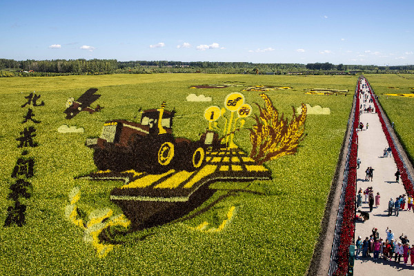 游客在北大荒集團(tuán)閆家崗農(nóng)場有限公司農(nóng)業(yè)現(xiàn)代化示范區(qū)游覽。