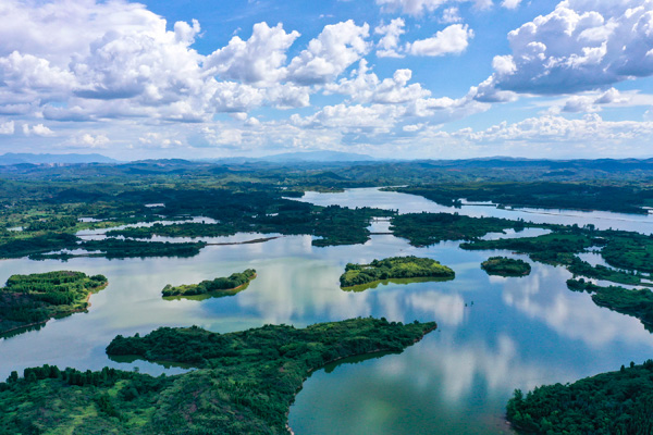 8月6日,湖南桂陽舂陵國(guó)家濕地公園,綠水、濕地、藍(lán)天相映成趣,構(gòu)成一幅秀美的夏日生態(tài)畫卷(無人機(jī)照片)。