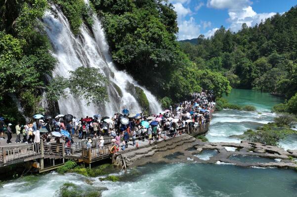 日前,前往貴州省荔波小七孔風(fēng)景區(qū)游玩的游客激增,景區(qū)各部門通力合作,服務(wù)游客,每天迎客超過6.2萬人次。