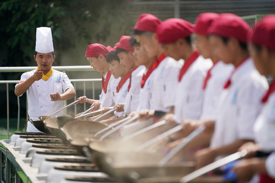 在位于西安市藍田縣的藍田廚師學(xué)校,教師成曉強(左一)指導(dǎo)學(xué)生們練習(xí)翻勺。新華社記者 李一博 攝