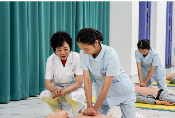 張先庚(左一)在護(hù)理實(shí)訓(xùn)室指導(dǎo)學(xué)生做急救操作。 李汶瑾 攝