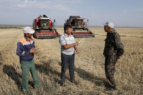 2022年9月2日,在哈薩克斯坦北哈薩克斯坦州,與愛菊集團(tuán)合作的農(nóng)場主在收割。新華社發(fā)(奧斯帕諾夫攝)