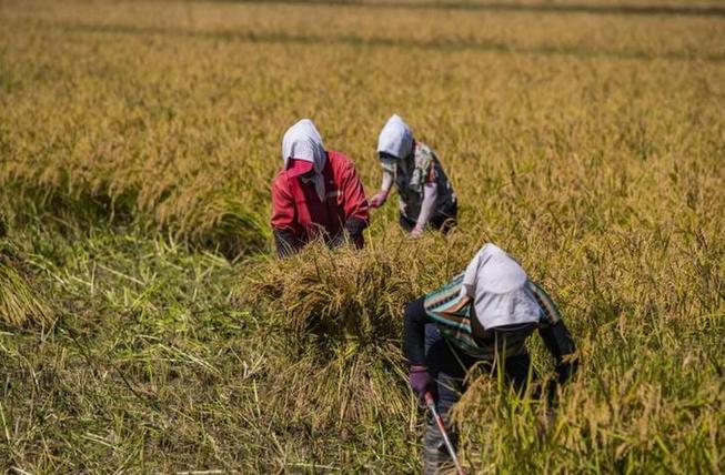 圖為在盤錦市大洼區(qū)高坎村,農(nóng)戶在收割水稻。 受訪者供圖