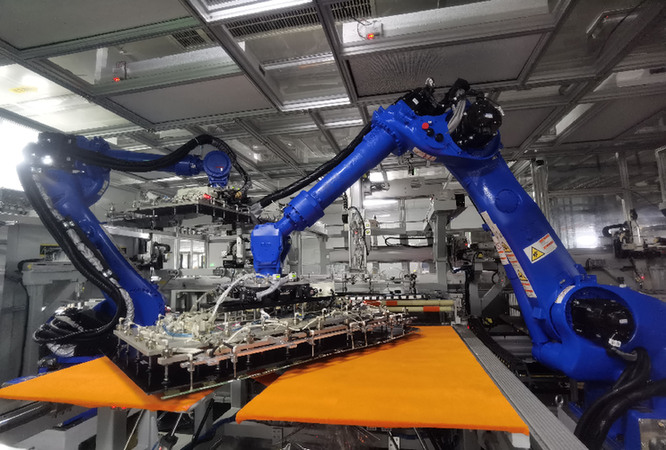 在海信視像智能車間的生產(chǎn)線上,機(jī)器人對液晶面板和背光板自動化精準(zhǔn)卡合。記者 王凱 攝