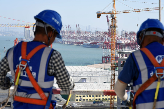 國慶長假期間,在位于中國(山東)自由貿(mào)易試驗區(qū)青島片區(qū)的航運貿(mào)易金融融合創(chuàng)新基地項目上,600多名建設(shè)者堅守一線,搶抓施工黃金期,奮力沖刺項目建設(shè)關(guān)鍵節(jié)點。圖為中鐵建工建設(shè)者在進行外墻吊裝施工準(zhǔn)備。新華社記者 李紫恒 攝