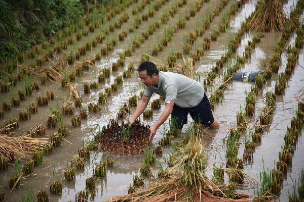 臺江縣排羊鄉(xiāng)排羊村村民在收割后的稻田里捕撈“稻花魚”。