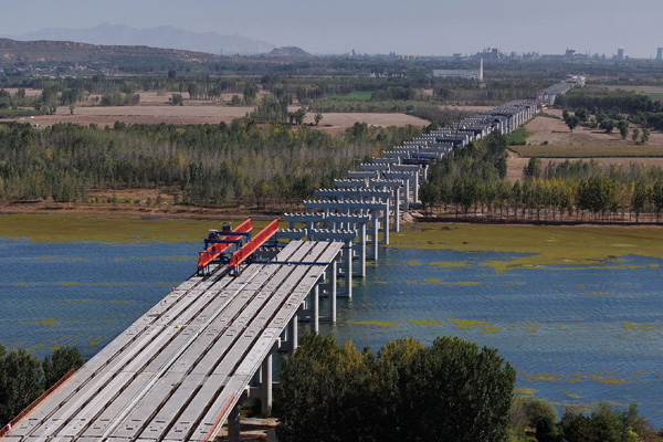圖為工人在唐山灤州市內(nèi)的秦唐高速公路跨灤河大橋建設(shè)工地施工(無人機(jī)照片)。