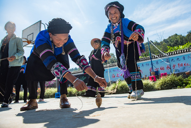 10月22日,云南省文山壯族苗族自治州馬關(guān)縣木廠鎮(zhèn)楊茂松村村民在重陽節(jié)活動中打陀螺。