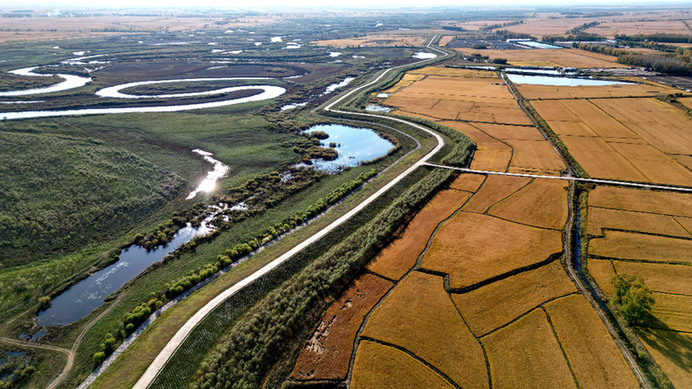 金秋十月,位于黑龍江省東部、松花江下游湯原縣的黑魚泡省級自然保護區(qū)內,聚集著成群結隊即將南下越冬的鳥類,濕地里的水草也從鮮綠變向暖黃色。隔著一條堤壩,比鄰的稻田泛著金燦燦的光,滿眼豐收景象。濕地與農田相互映襯,構成一幅和諧共生的美麗畫卷。
