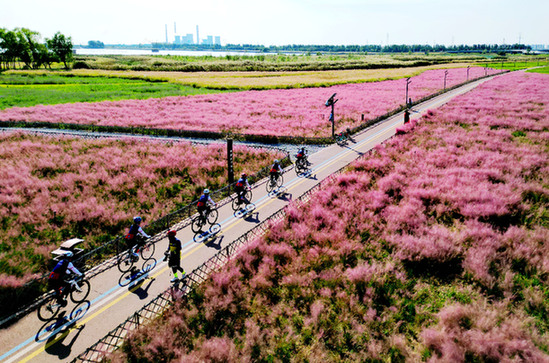 騎行愛好者在山東省東營市東營區(qū)耿井濕地粉黛亂子草區(qū)騎行,欣賞濕地風(fēng)光。資料照片