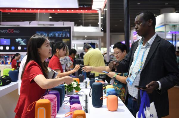 在第134屆廣交會(huì)上,來自蘇丹的采購商在智能音箱展臺(tái)洽談。新華社記者 鄧華 攝