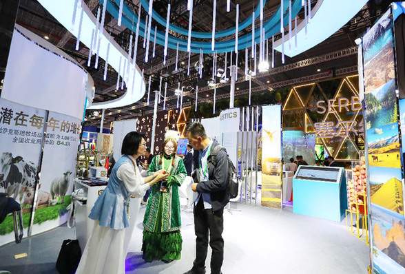 11月6日,一名參觀者(右)在第六屆進(jìn)博會國家展哈薩克斯坦展臺與工作人員交談。第六屆進(jìn)博會國家展全面恢復(fù)線下舉辦,洪都拉斯、塞爾維亞、越南、南非、哈薩克斯坦作為本屆進(jìn)博會主賓國在國家展亮相?!⌒氯A社記者 方喆 攝