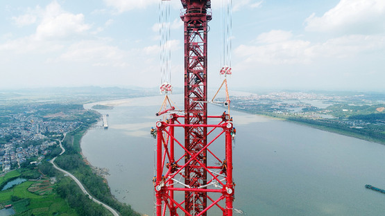 在湖北黃石陽(yáng)新縣,國(guó)網(wǎng)湖北電力員工正在組立武漢—南昌1000千伏特高壓工程長(zhǎng)江大跨越段南岸跨越塔。鄒小民 攝