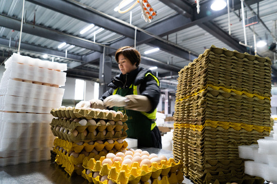 2月20日,安徽田園居電子商務股份有限公司物流員工正在將分揀好的雞蛋打包寄出。記者 趙金正 攝