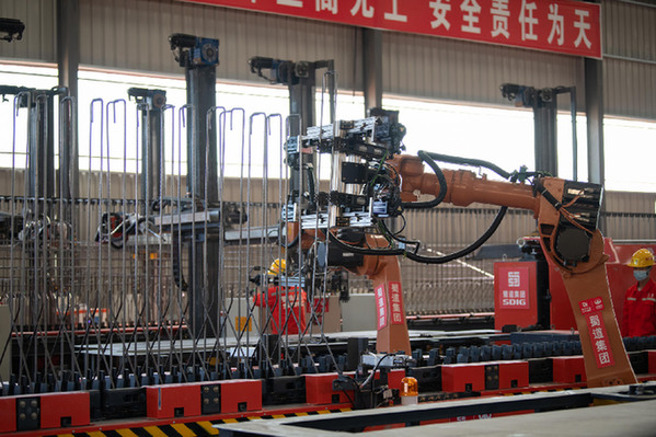 圖為“智慧梁廠”的機(jī)械臂在生產(chǎn)線上作業(yè)。位于四川會(huì)理的沿江高速“智慧梁廠”由蜀道集團(tuán)投建,主要生產(chǎn)高速公路橋梁建造所需的T梁?!⌒氯A社記者 胥冰潔 攝
