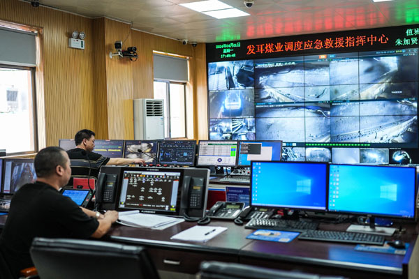 2018年,發(fā)耳煤礦在貴州率先建成智能化綜采工作面,成為貴州省第一家實現(xiàn)綜采工作面智能化、生產(chǎn)輔助系統(tǒng)信息化的礦井。圖為4月1日,發(fā)耳煤業(yè)工作人員在調(diào)度應急救援指揮中心工作。記者 陶亮 攝